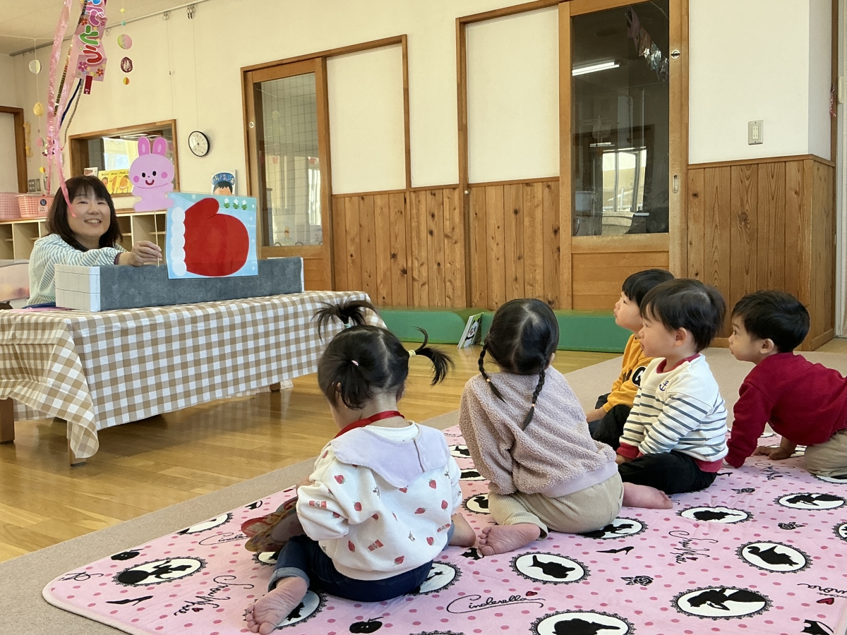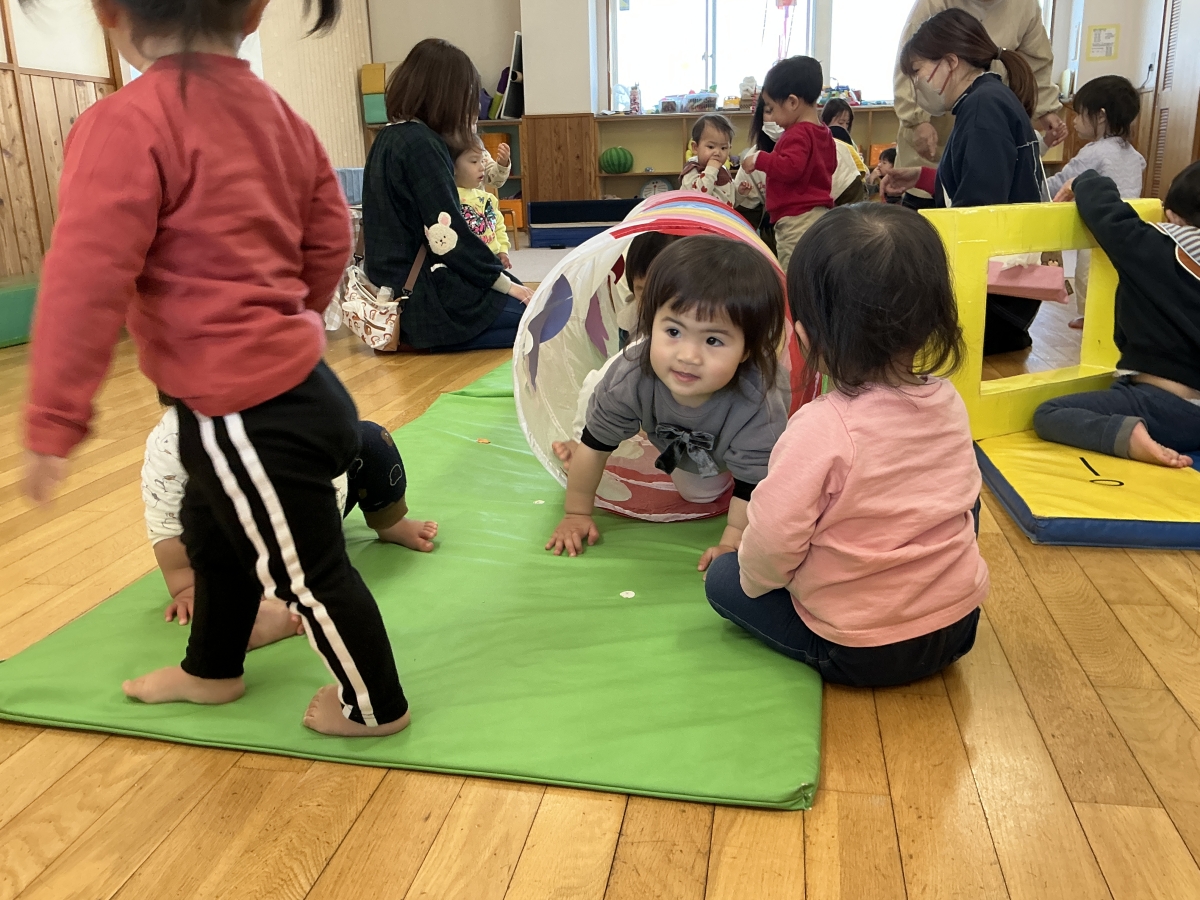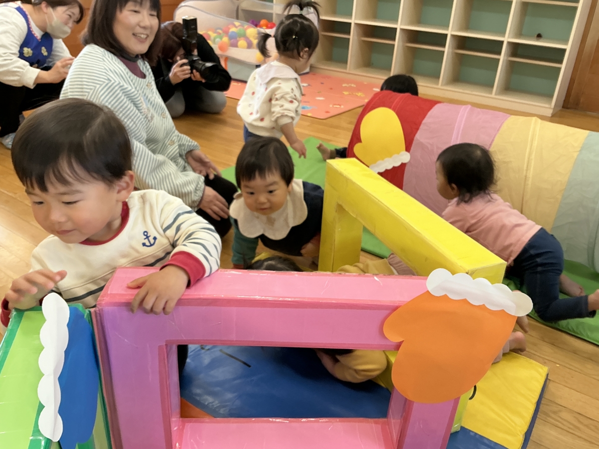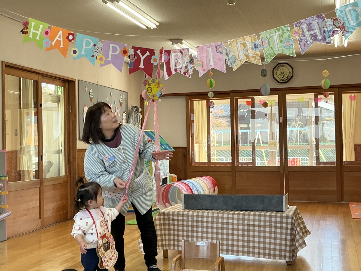 パタパタマジックを見ていると、ケーキが出てきました。くす玉割をしました。アクシデント発生!引っ張ったらハッピーバースデイの飾りも落ちちゃった...ピアニカの伴奏で歌のプレゼント“てぶくろ”のペープサートを見たよ!最後に手袋トンネルをくぐって楽しみました。