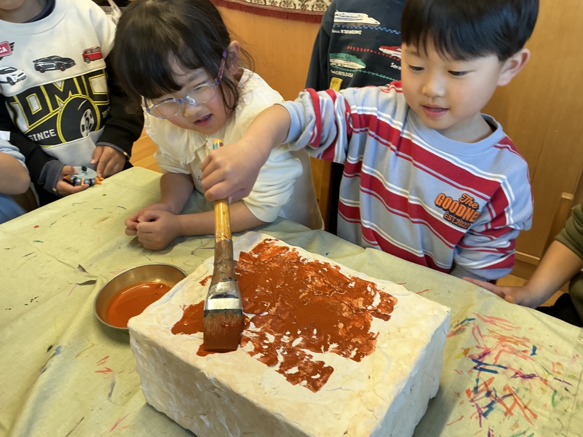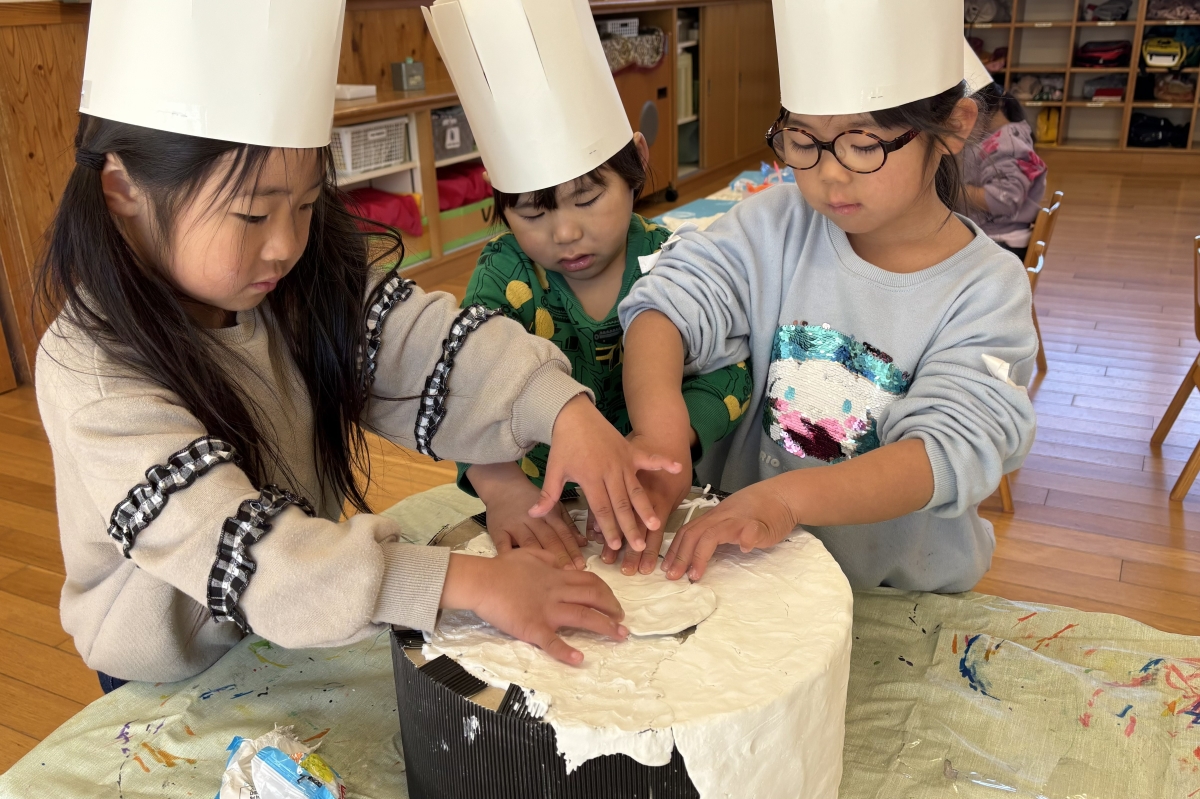 子ども達からどんどんアイデアが出て、大きなイチゴのケーキとチョコケーキができました!