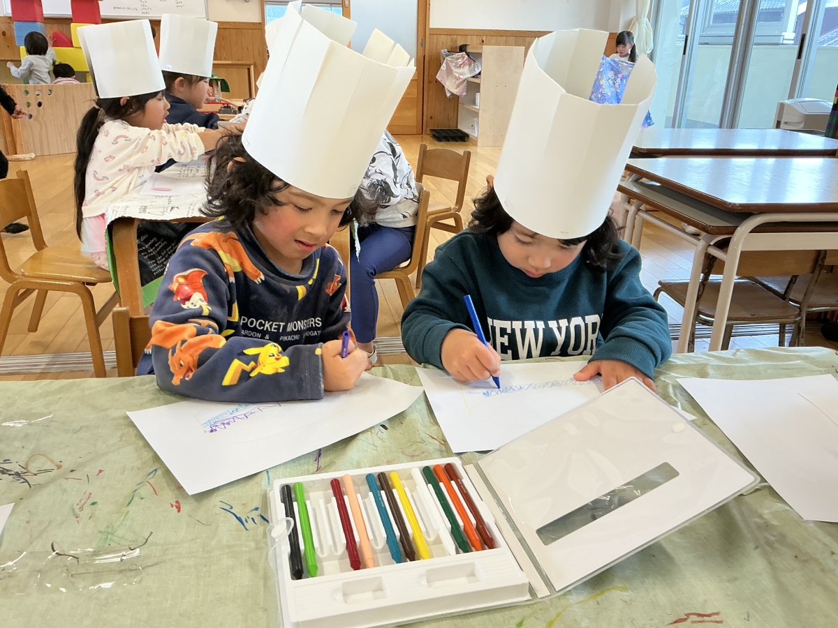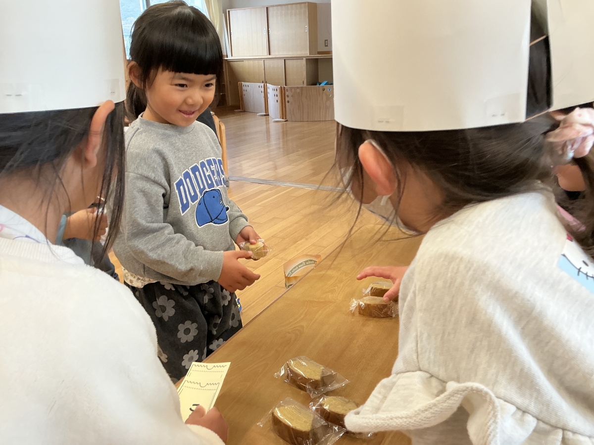 みどり組さんのみんなで話し合いをし、ケーキ屋さんを開いてきい組さんを招待することに!