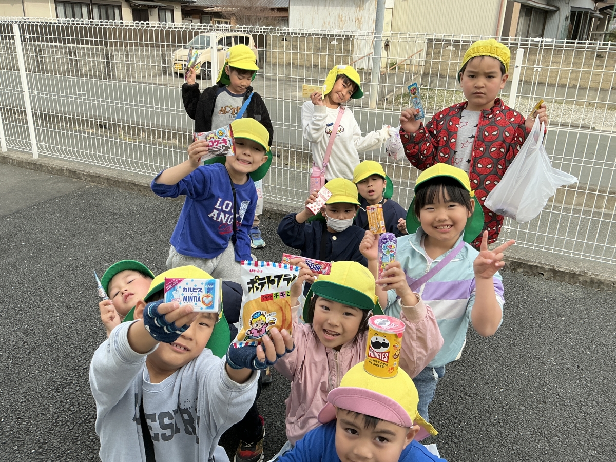 お菓子を入れるエコバックも自分たちで作ったよ!友達と話しながら作ったり、ひらがなを教えてもらう姿もありましたいざ!出発進行~!!何があるかな~?ワクワク