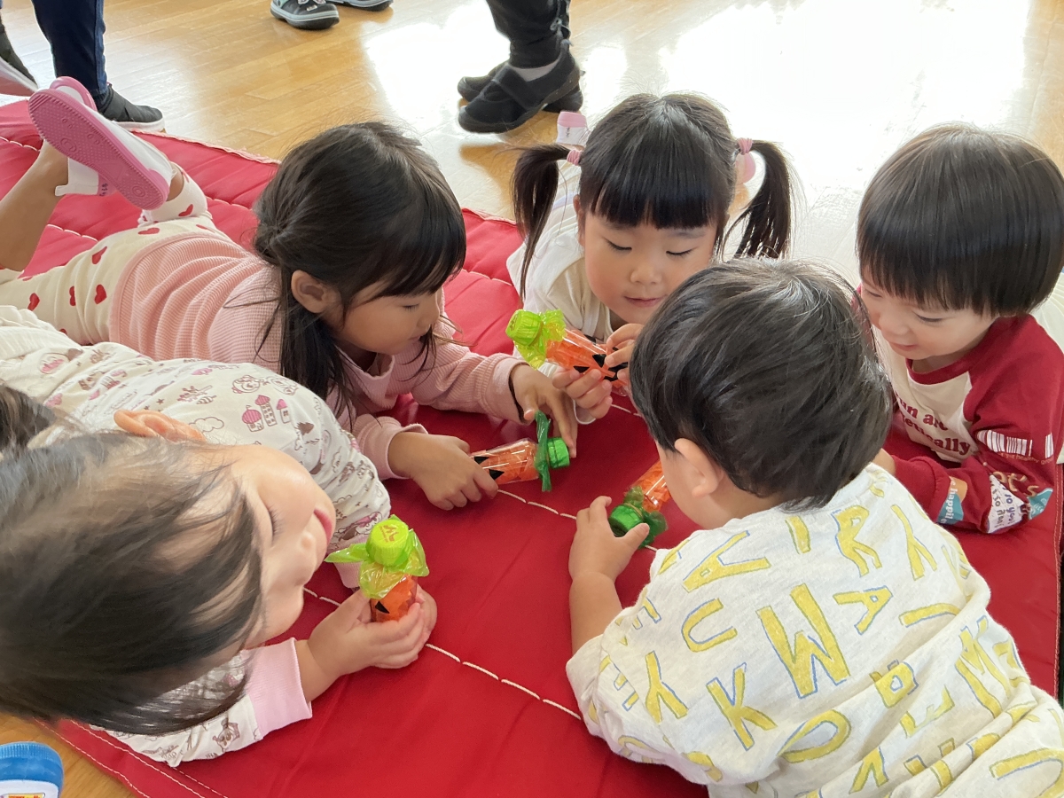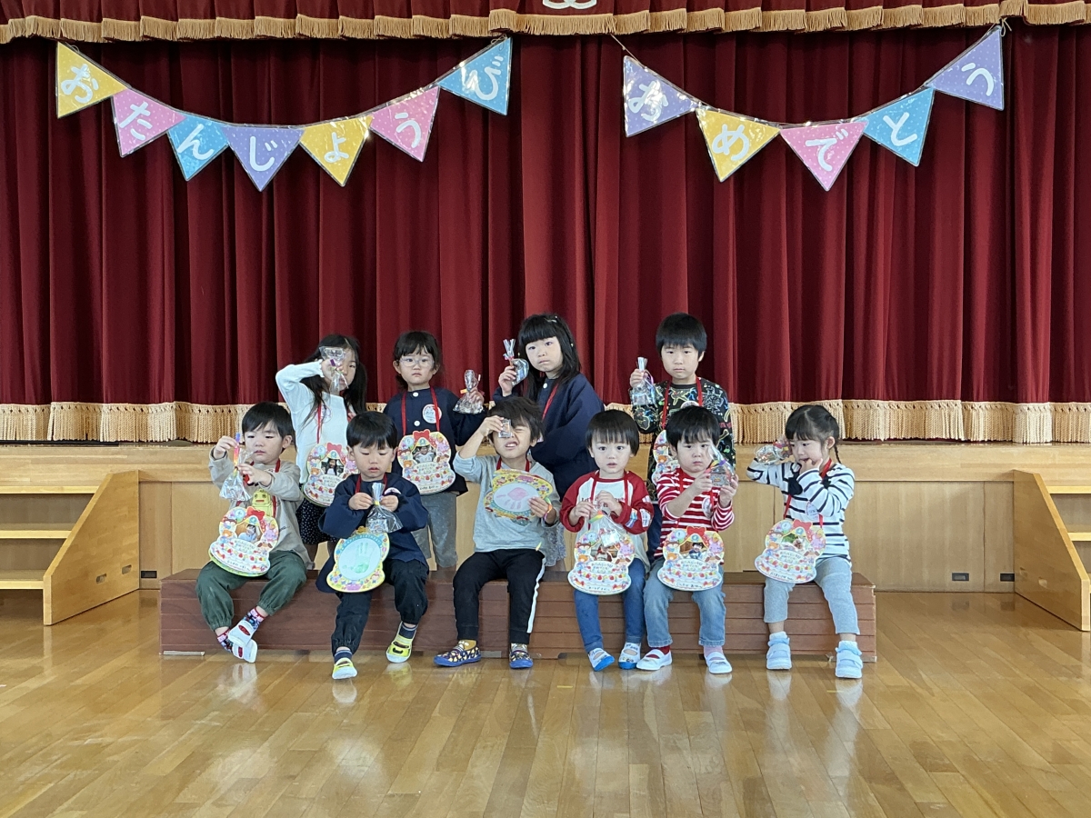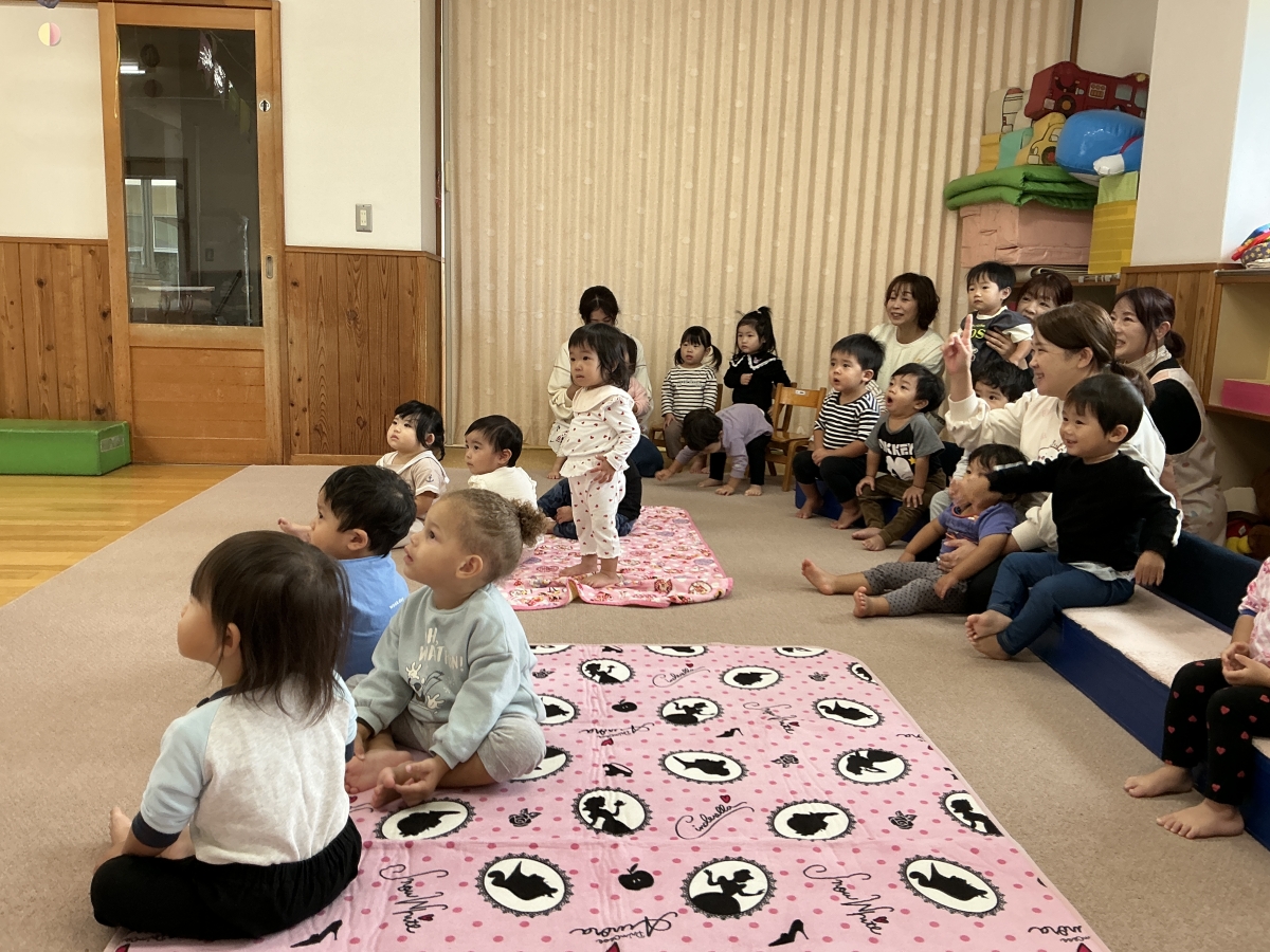 10月生まれの子のお誕生日会をしました。♪どんぐりころころ どんぶりこ~お池の中からどんぐりのお友達2人来ましたよ。10月生まれのお友達だね。お名前は?”〇ーちゃん”自分の名前を上手に言えましたね。