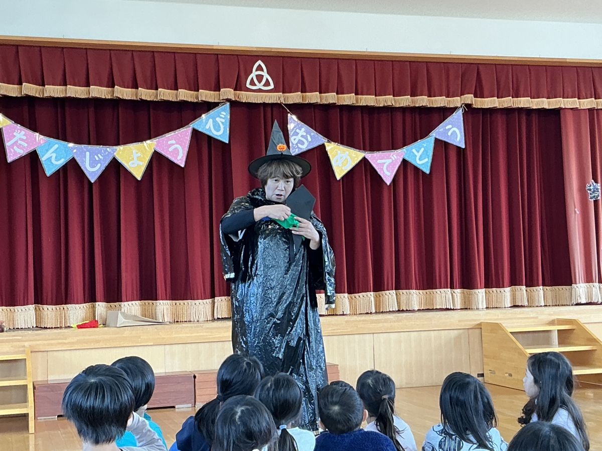 さて、お次は幼児クラス。ハロウインパーティーの始まり??魔女だー!この魔女さんは、なんと手品師。様々な手品を見せてくれ、子ども達も大興奮。