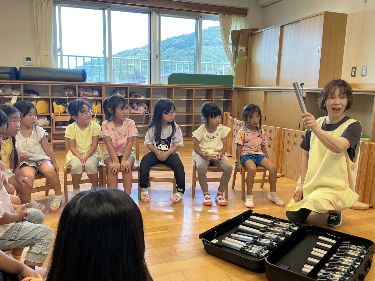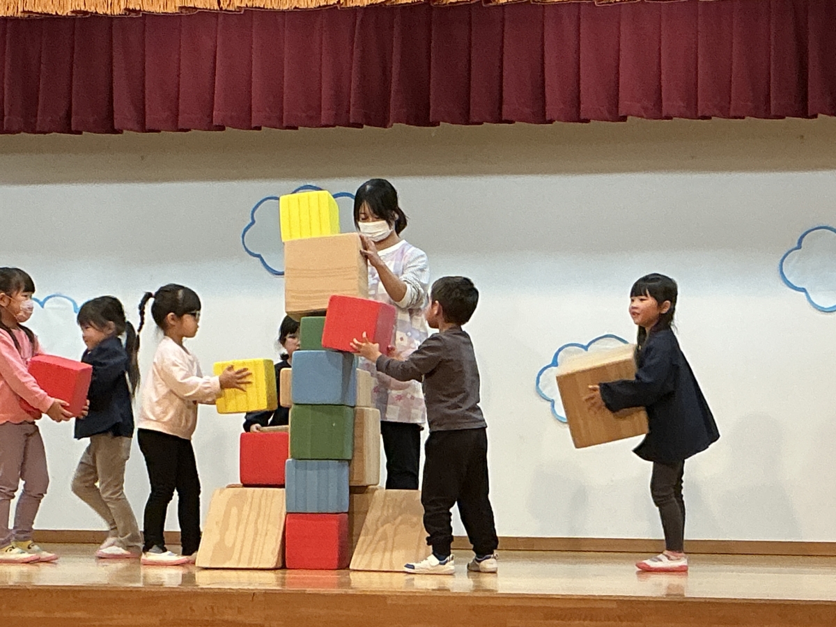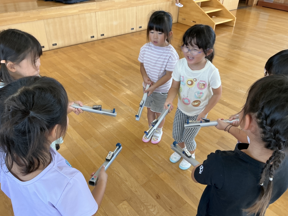 みどり組 初めてのトーンチャイム。”わぁ~きれいな音がする””大切な物?宝物?優しく使うよ”琉球音楽や、黒鍵の調べの音楽に合わせ、自分の音を出したいときに出すと言う初めての試みをします。とても楽しみです。劇遊びはマインクラフトの積み木遊び。とても楽しそうにやっていますよ。