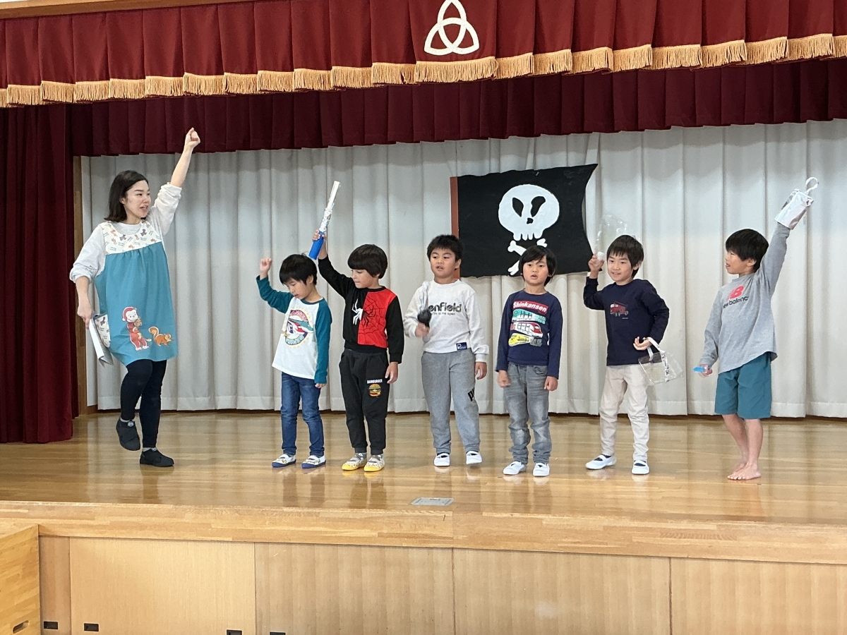きい組5歳児 ピーターパンの劇遊び。役になり切って楽しんでいますよ。海賊・フック船長・スミー・ワニ 張り切ってダンスをしたり、戦いをしたりしていますよ。きい組は全員自分たちで工夫しながら衣装、小道具をつくりました。当日が楽しみです。