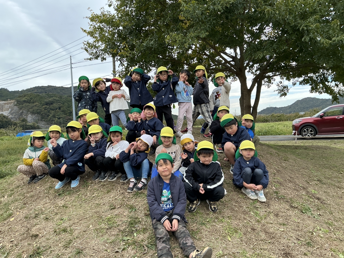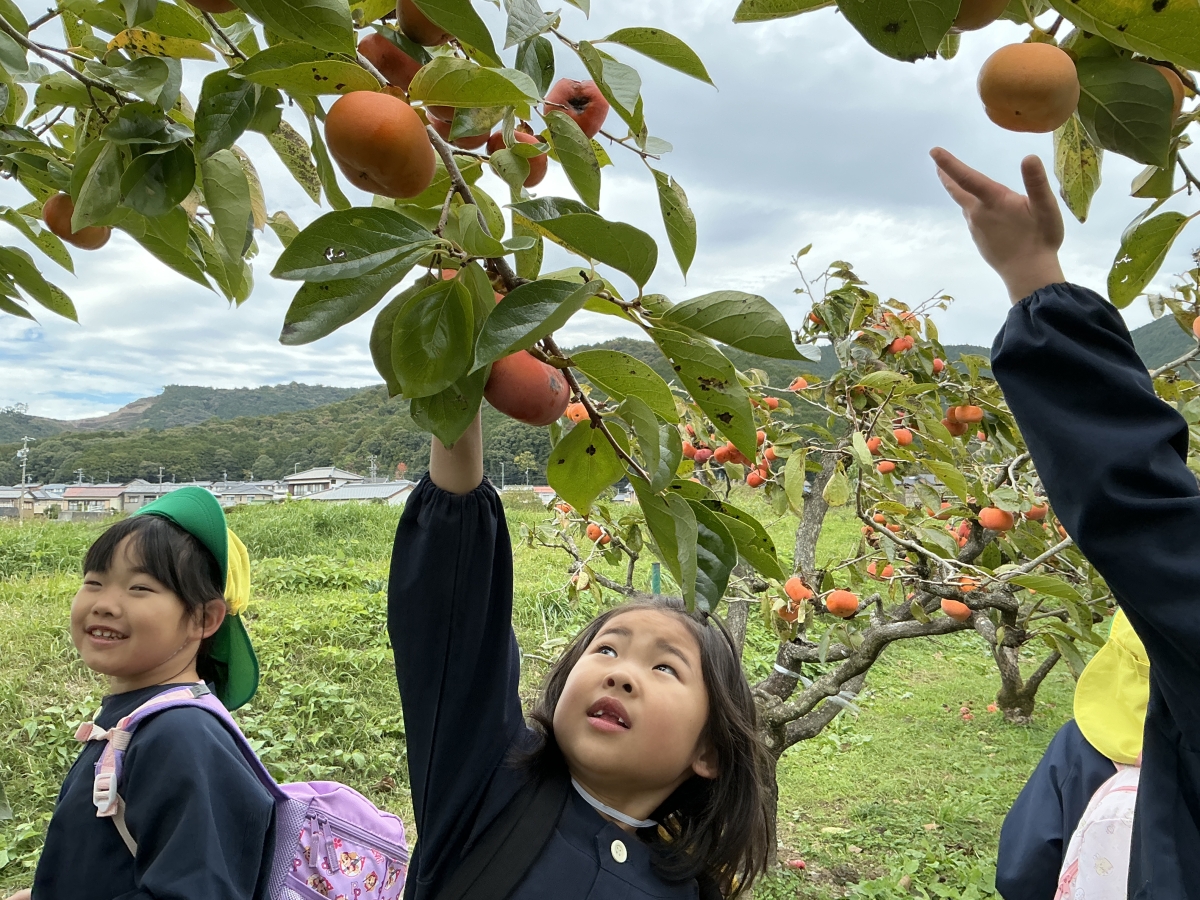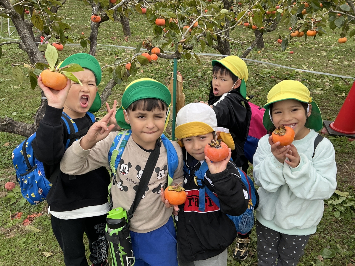 子ども達が楽しみにしていた秋の遠足にでかけました。きい組(5歳児)は路線バスに乗り、嵩山方面にでかけ、森の探検(通称トトロの森)をしたり、草原(ハイジの草原)で思い切り体を動かして遊んだり、な・なんと、嵩山の地元の方のご厚意により、柿狩りをさせて頂きました。初めての体験で子ども達は大喜びでした。