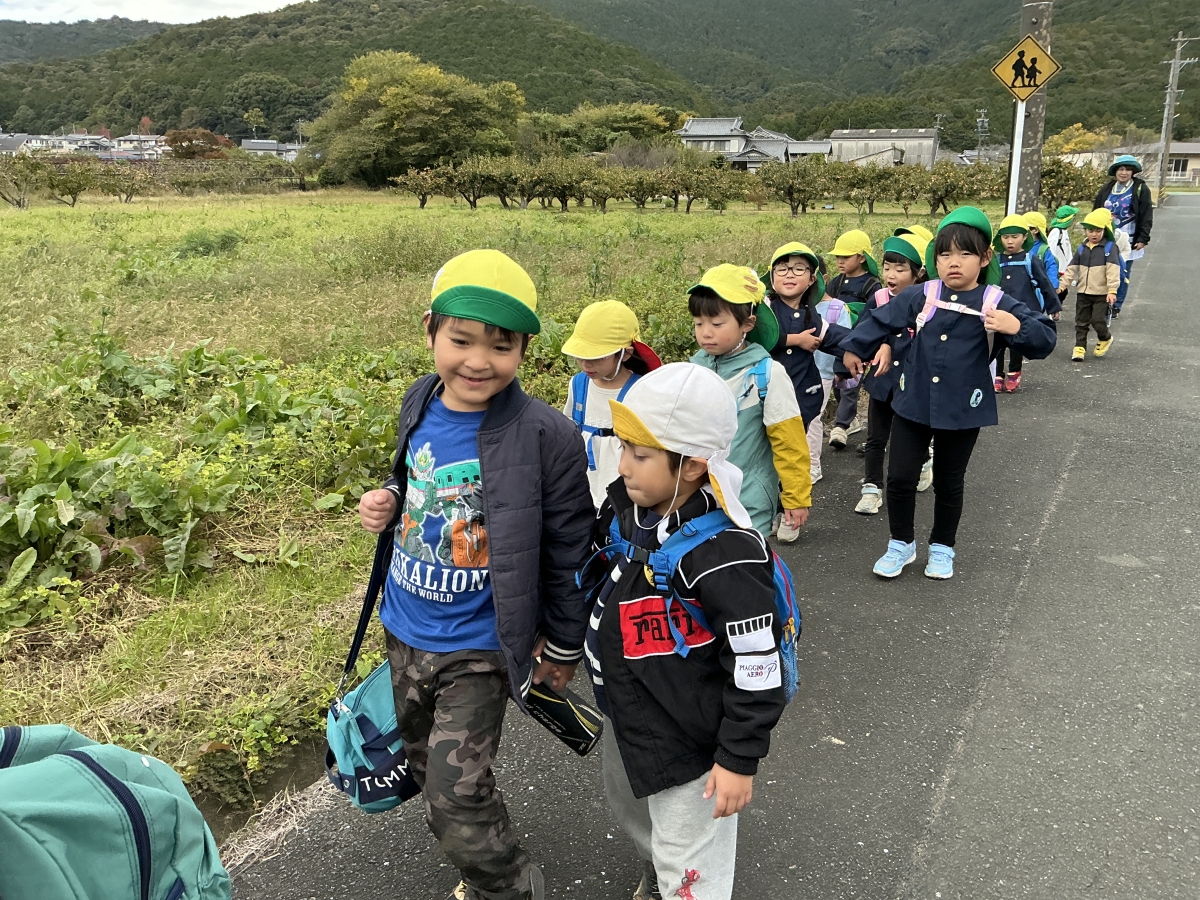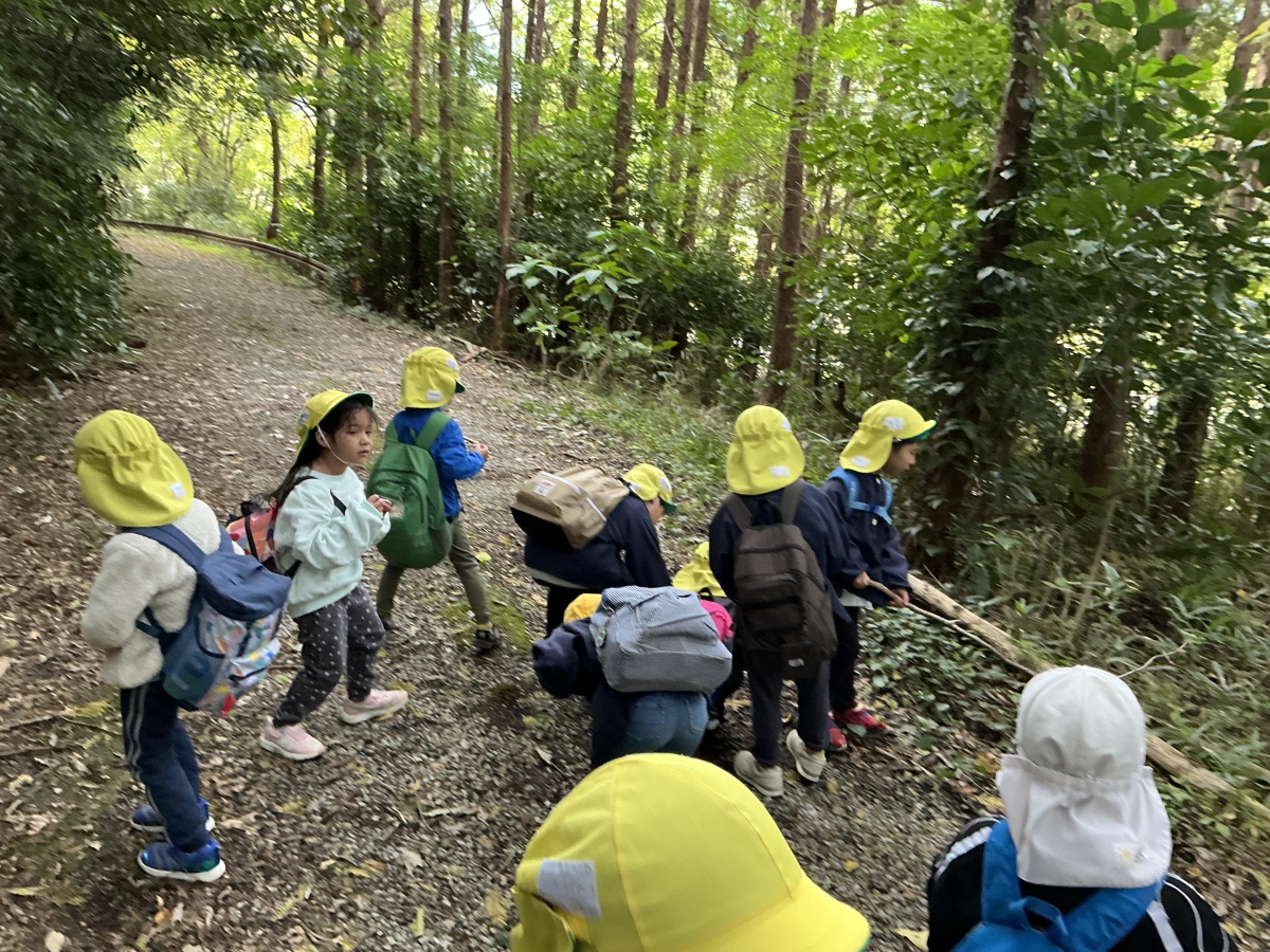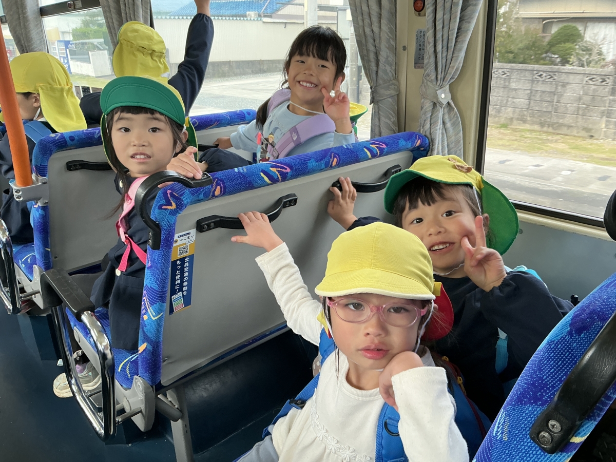 子ども達が楽しみにしていた秋の遠足にでかけました。きい組(5歳児)は路線バスに乗り、嵩山方面にでかけ、森の探検(通称トトロの森)をしたり、草原(ハイジの草原)で思い切り体を動かして遊んだり、な・なんと、嵩山の地元の方のご厚意により、柿狩りをさせて頂きました。初めての体験で子ども達は大喜びでした。