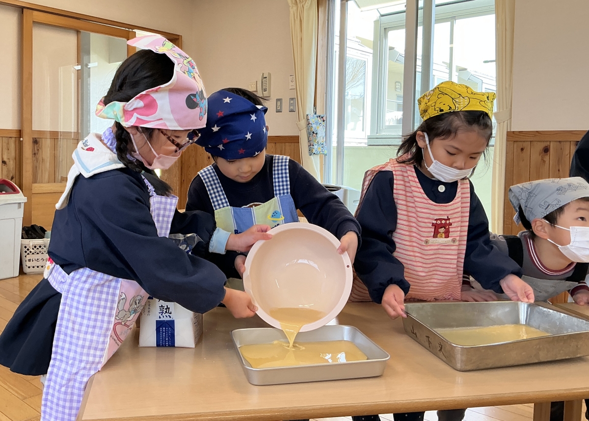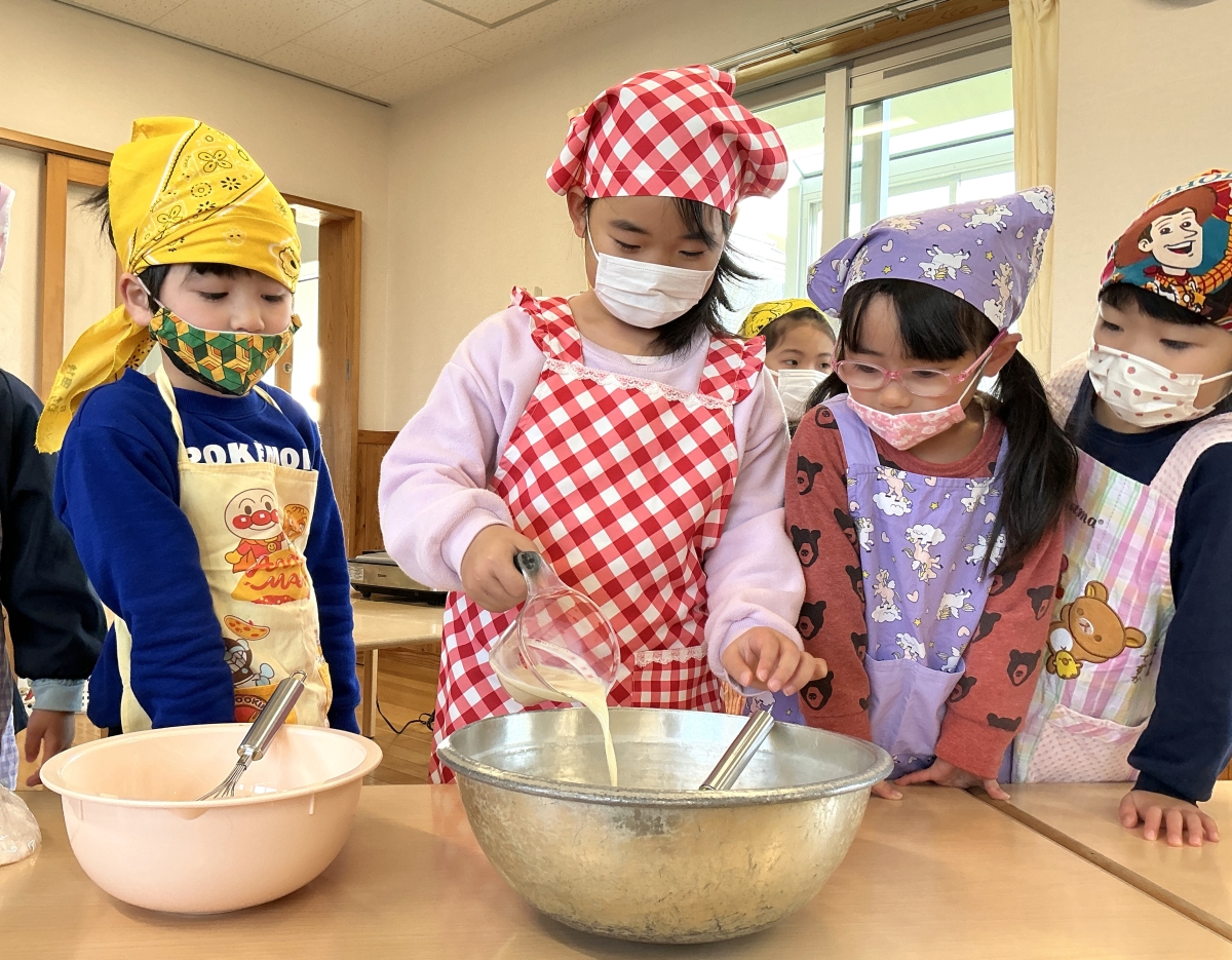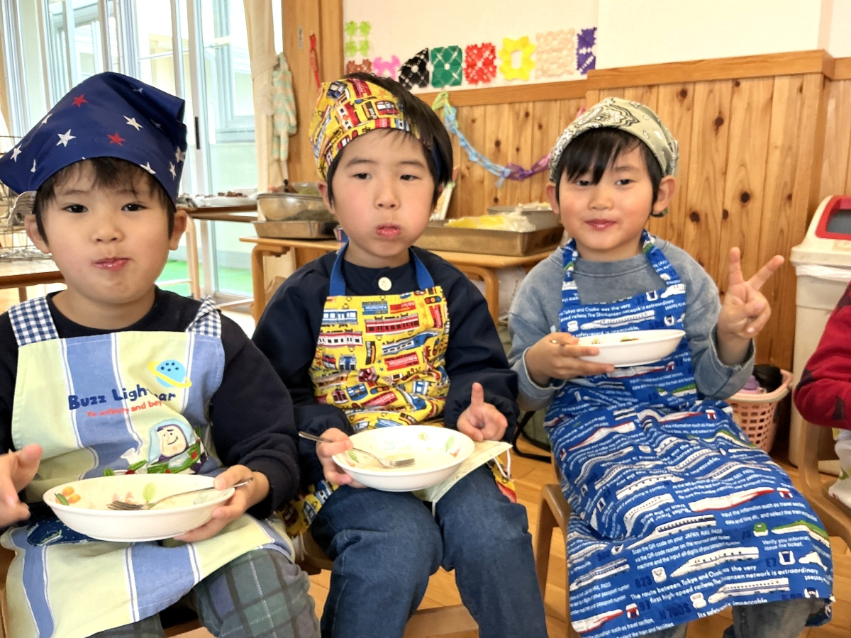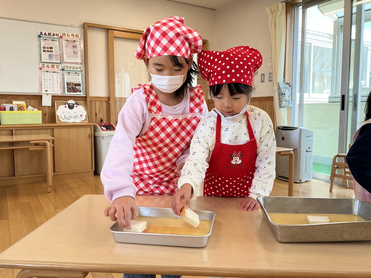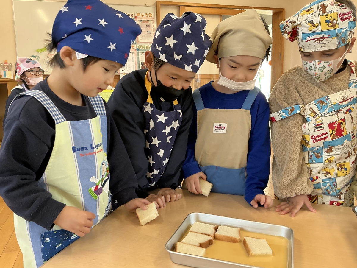 絵本のパンどろぼうシリーズを見ているとき、保育者の「このフレンチトースト美味しそう!」の声を