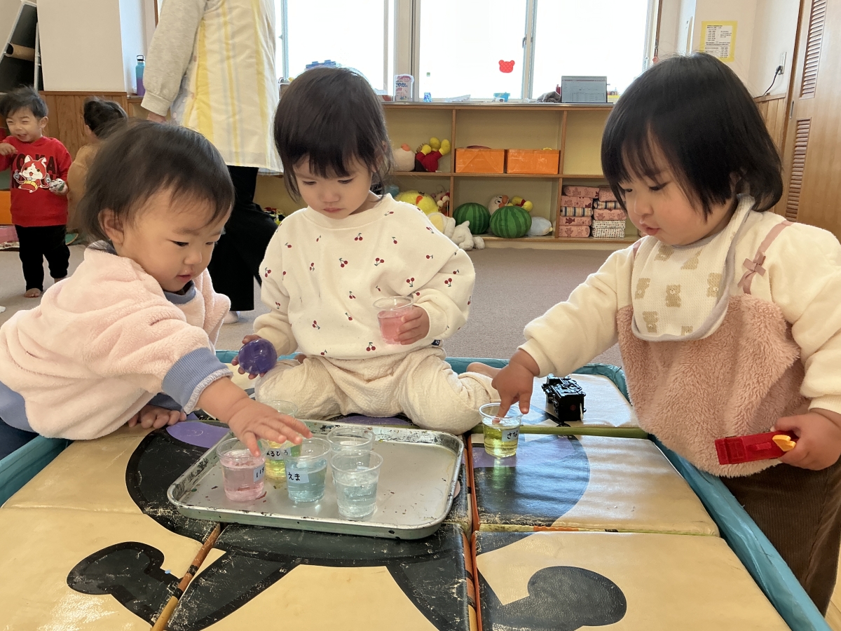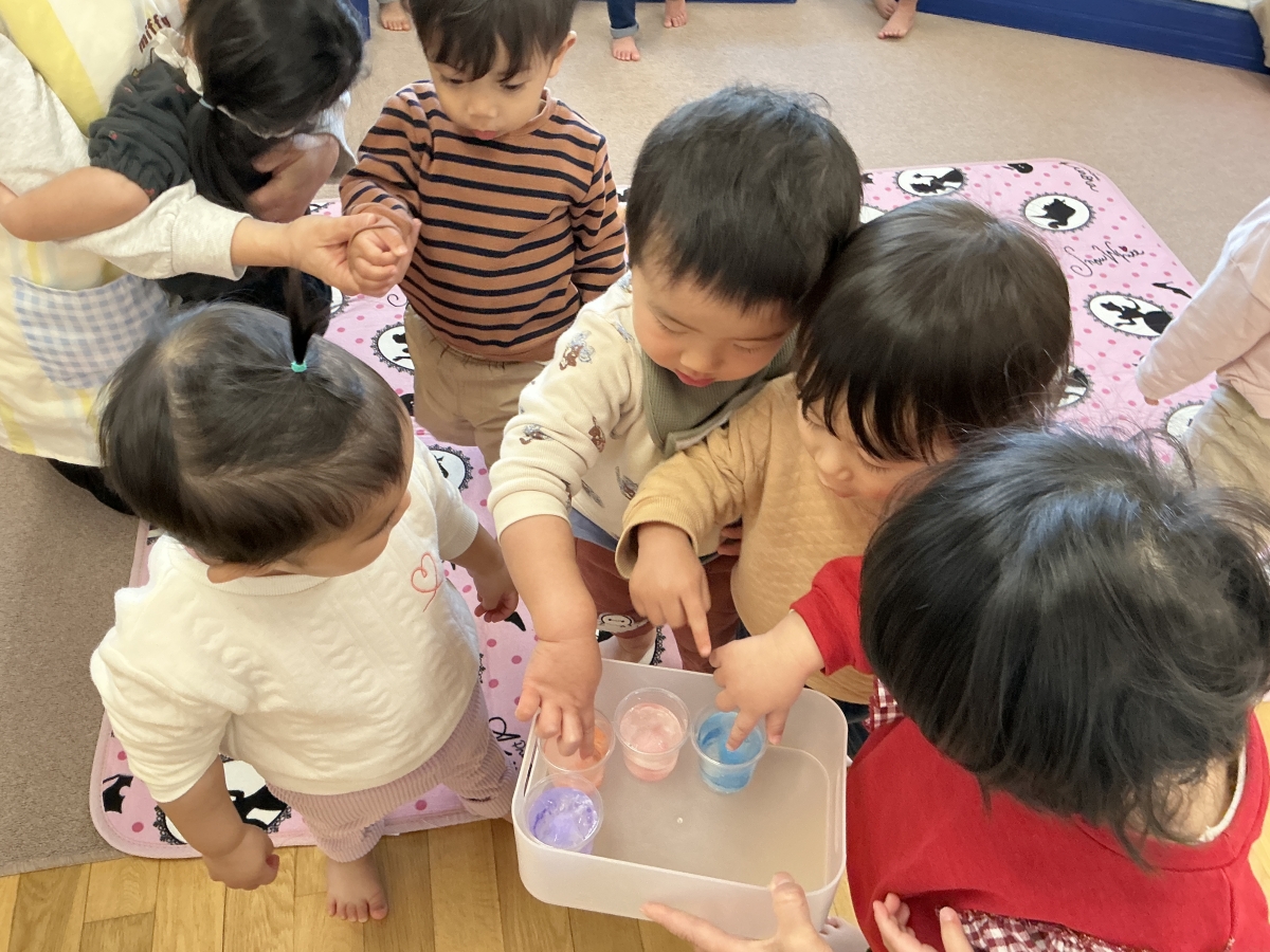 液体じゃない様子を不思議に思ってみんなでつついています♡