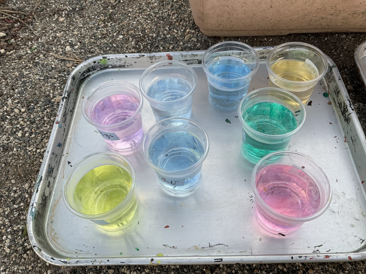 お絵描きしたプラカップにお水を入れたらきれいな色水☆彡